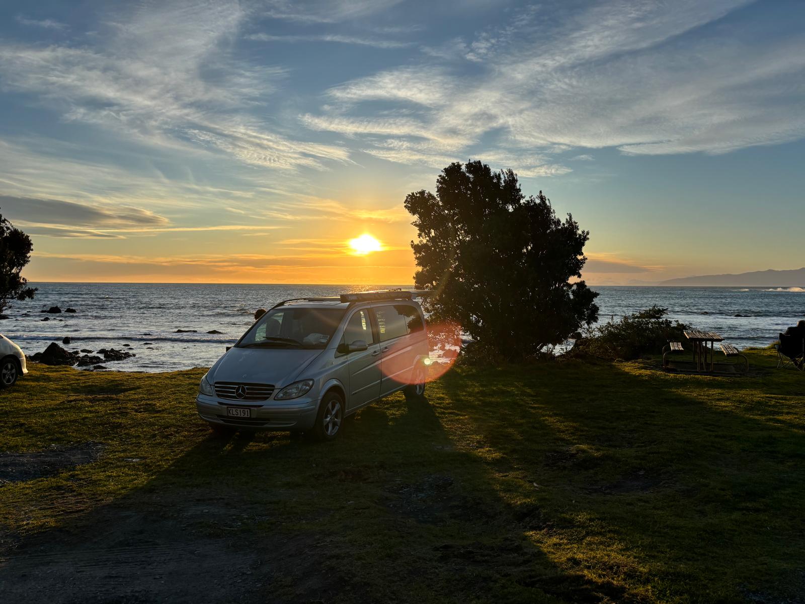 Heute war als Ausnahme mal ein wirklich schöner Tag, auch wenn die Nacht wirklich eisig war. Wir haben nämlich ein bisschen gefroren in unserem Auto. Aber sobald der Tag angebrochen ist war es auch wieder schön und die Sonne hat gelacht :D . Dann haben wir ein schönes Frühstück gemacht, wobei wir auf einen anderen Parkplatz fahren mussten, weil zwei Dauercamper (die haben in Bussen gewohnt) sich miteinander geprügelt haben und dann die Polizei kam. Nach einem aufregendem Morgen ging es dann also auch erstmal einkaufen für uns, und da es hier gefühlt nur eine richtige Supermarktkette gibt, natürlich in den Woolworths ;P . Jetzt hat es uns noch ein weiteres bisschen nach Süden verschlagen. Und da sind wir schon im Süden der Nordinsel von Neuseeland, am Pazifik.
