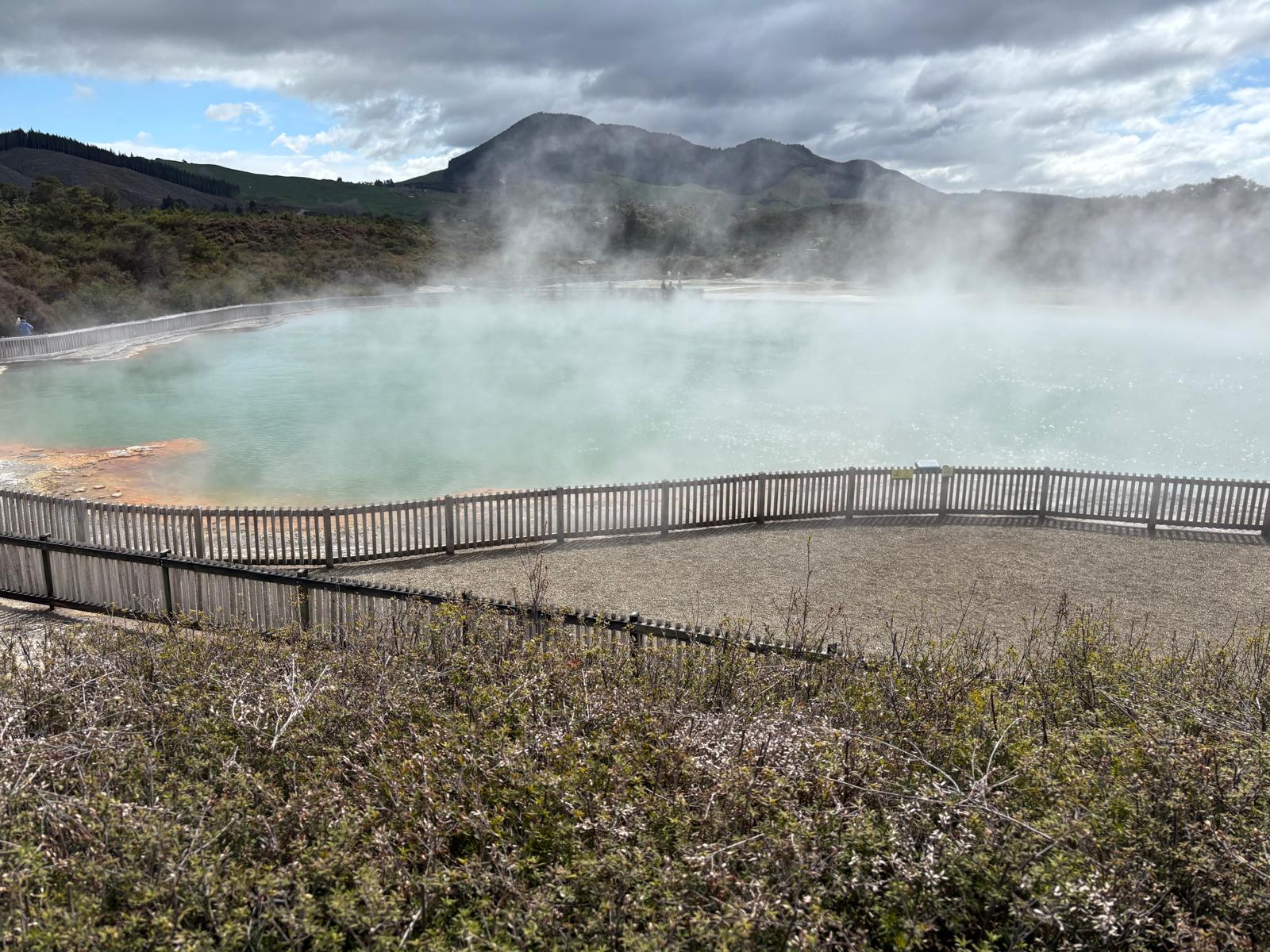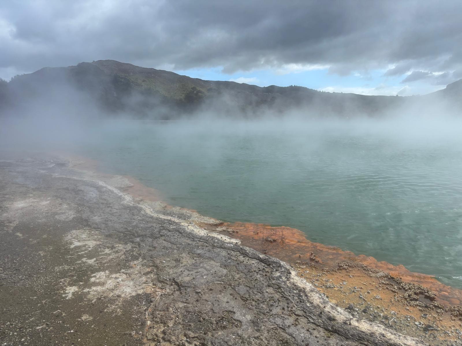 Heute sind wir wieder weiter gefahren. Diesmal ging es zu den heißen Quellen, welche hier einen Fluss entlang verlaufen. Das Wasser hatte jetzt keine Temperatur, dass man ewig drin bleiben konnte, aber im Gegensatz zu der Außentemperatur war es sehr angenehm :D . Danach sind wir weiter in den "Wai-O-Tapu", einen Thermalpark, in welchem man natürliche Seen und Quellen mit heißen Wasser sehen kann, welches Schwefel- und Eisenhaltig ist. (Allerdings hat es so gestunken :c ). Danach sind wir weiter gefahren, da noch der halbe Tag vor uns lag. Weiter in den Süden, über die Berge. Zum Abschluss mussten aber natürlich auch noch einmal Fish and Chips probiert werden ... Es lohnt sich :) .